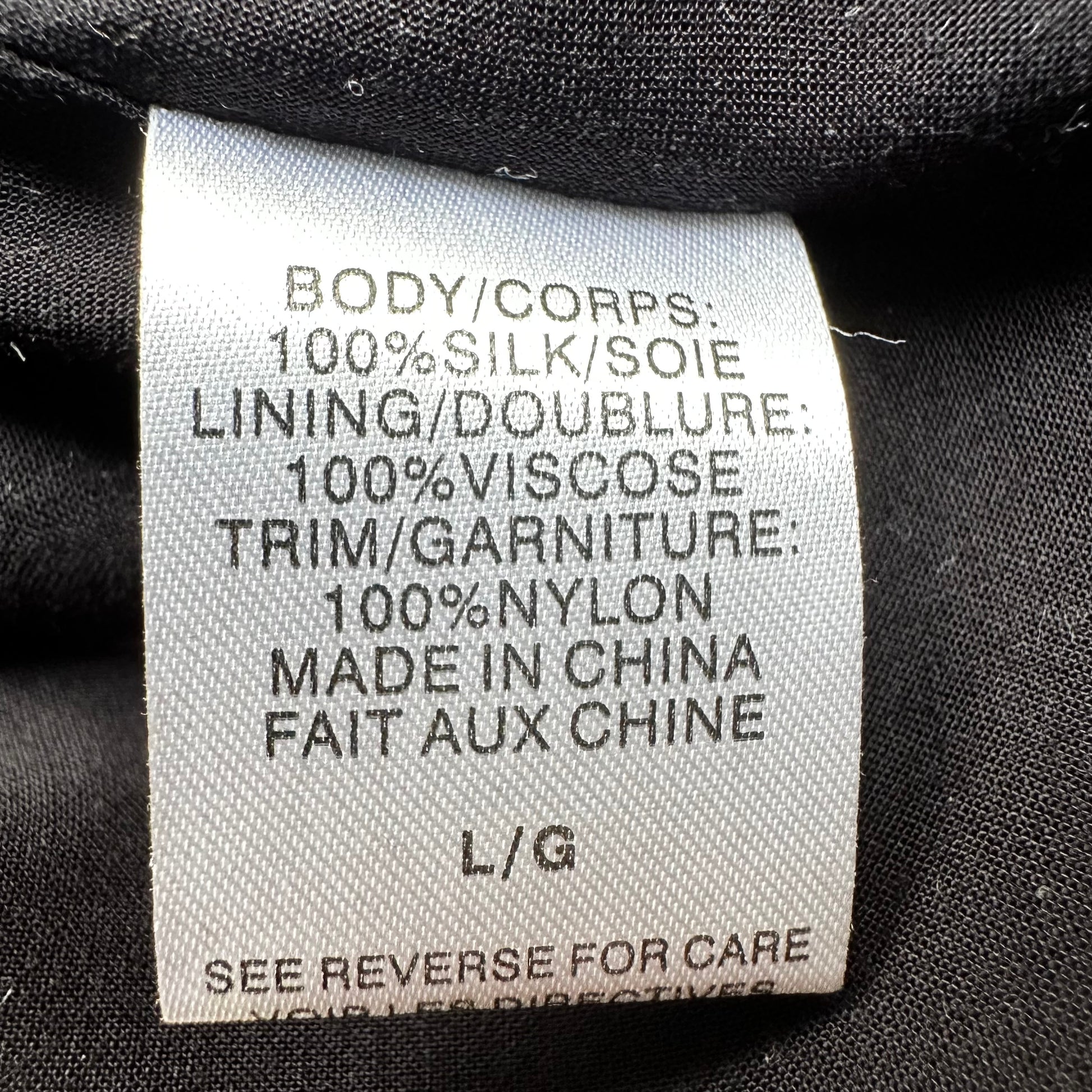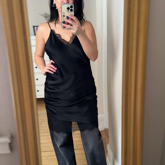 Elegant silk slip dress with adjustable straps and a flattering fit, delicately trimmed with lace at the neckline and hem.