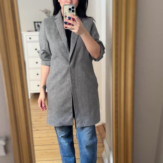 Incredible designer coat crafted from a luxurious wool blend. Its lightweight design and distinctive silhouette, featuring a stylish batwing sleeve (more than 3/4 length but less than full length), make it truly stand out.