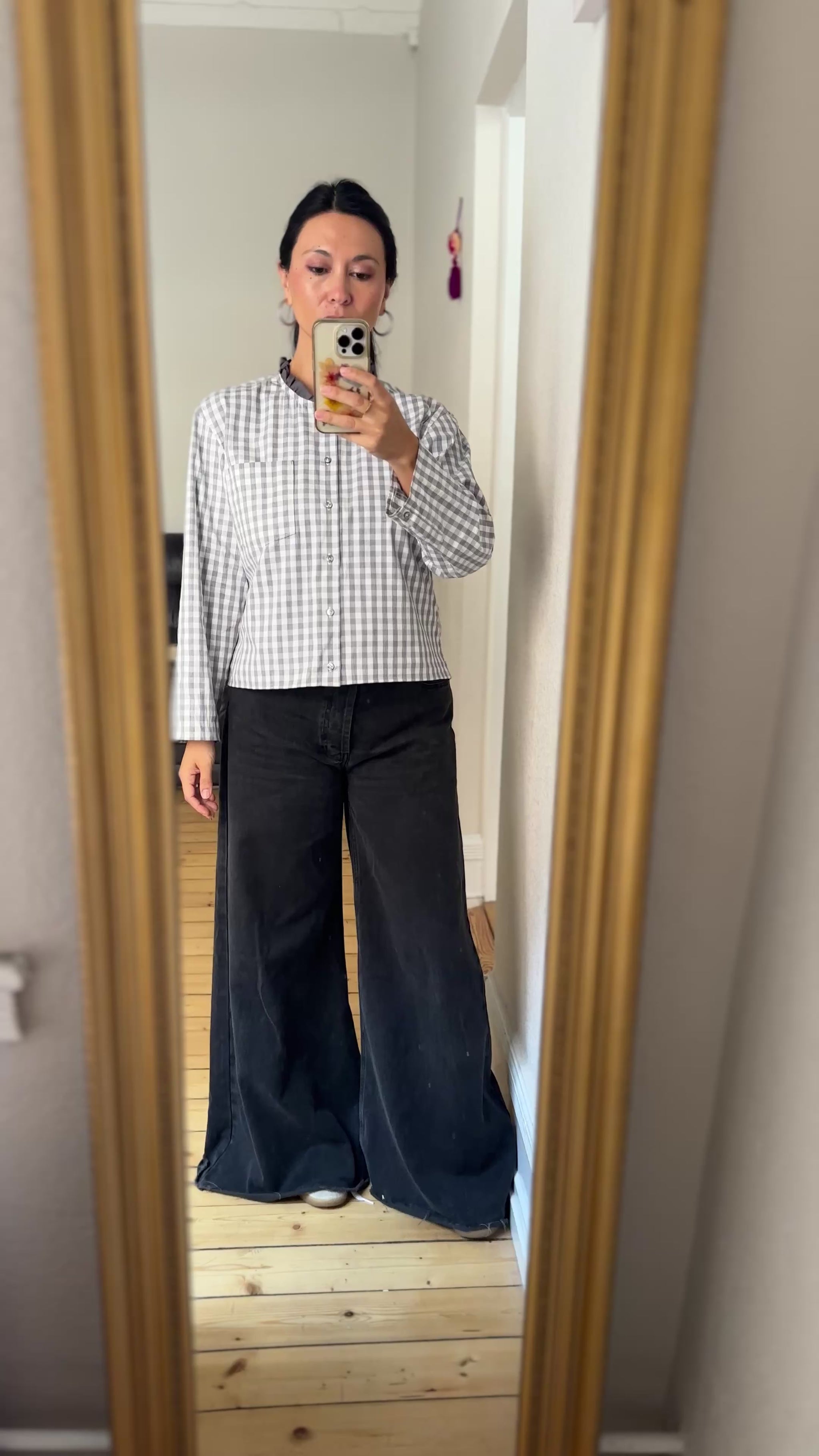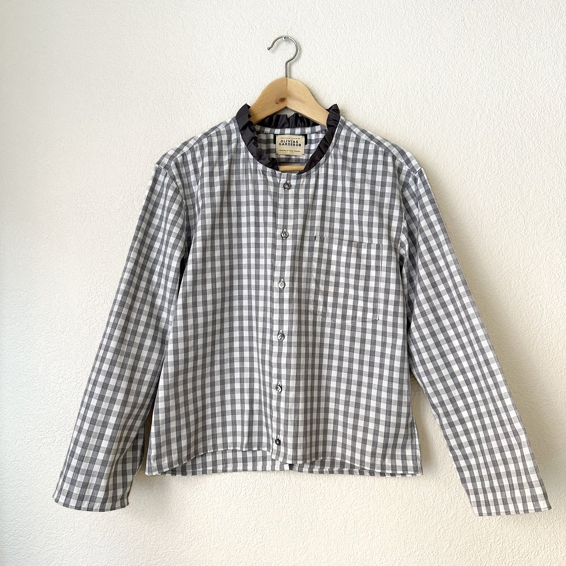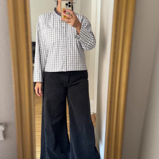 This blouse is crafted from a men's shirt, with additional details made from scraps from another project.