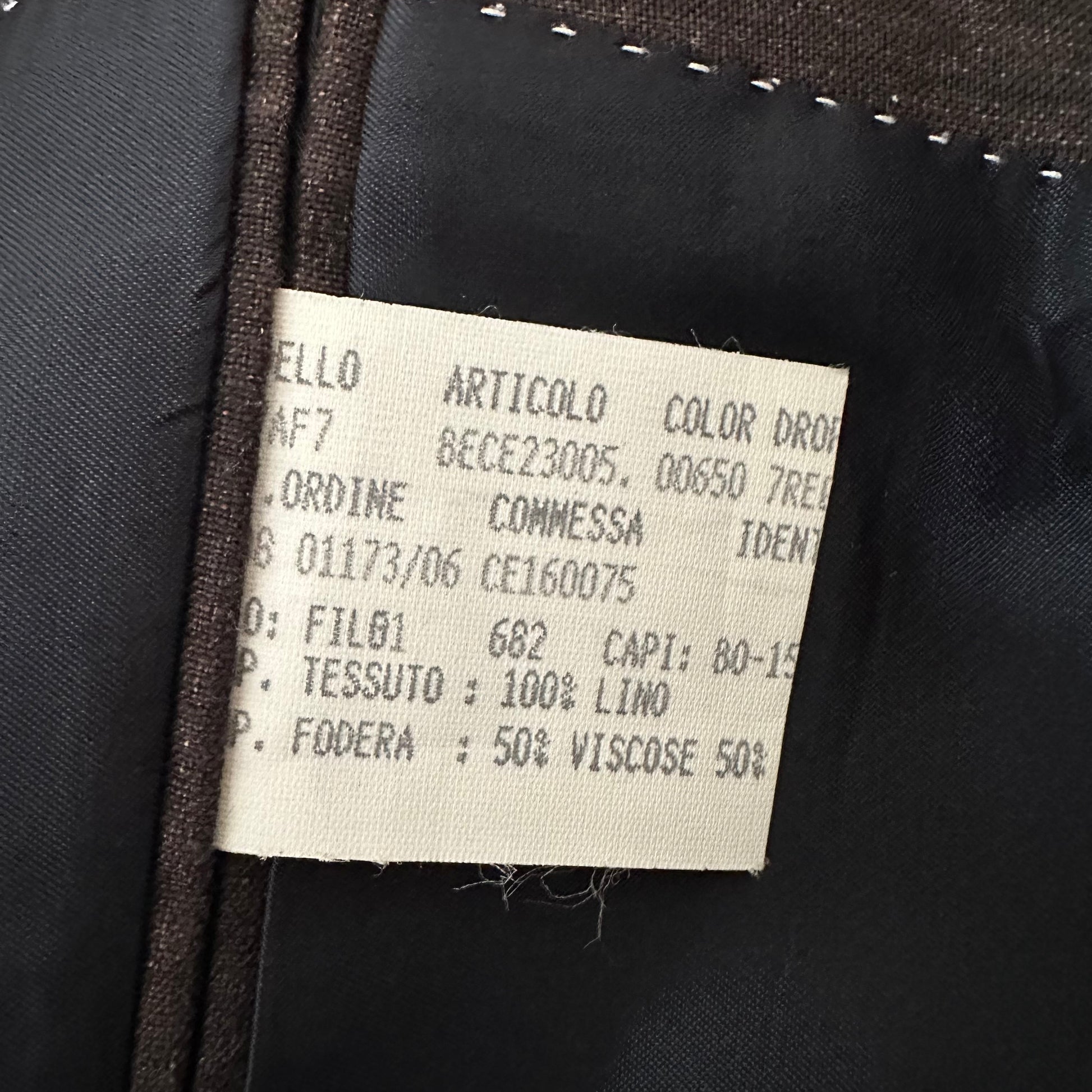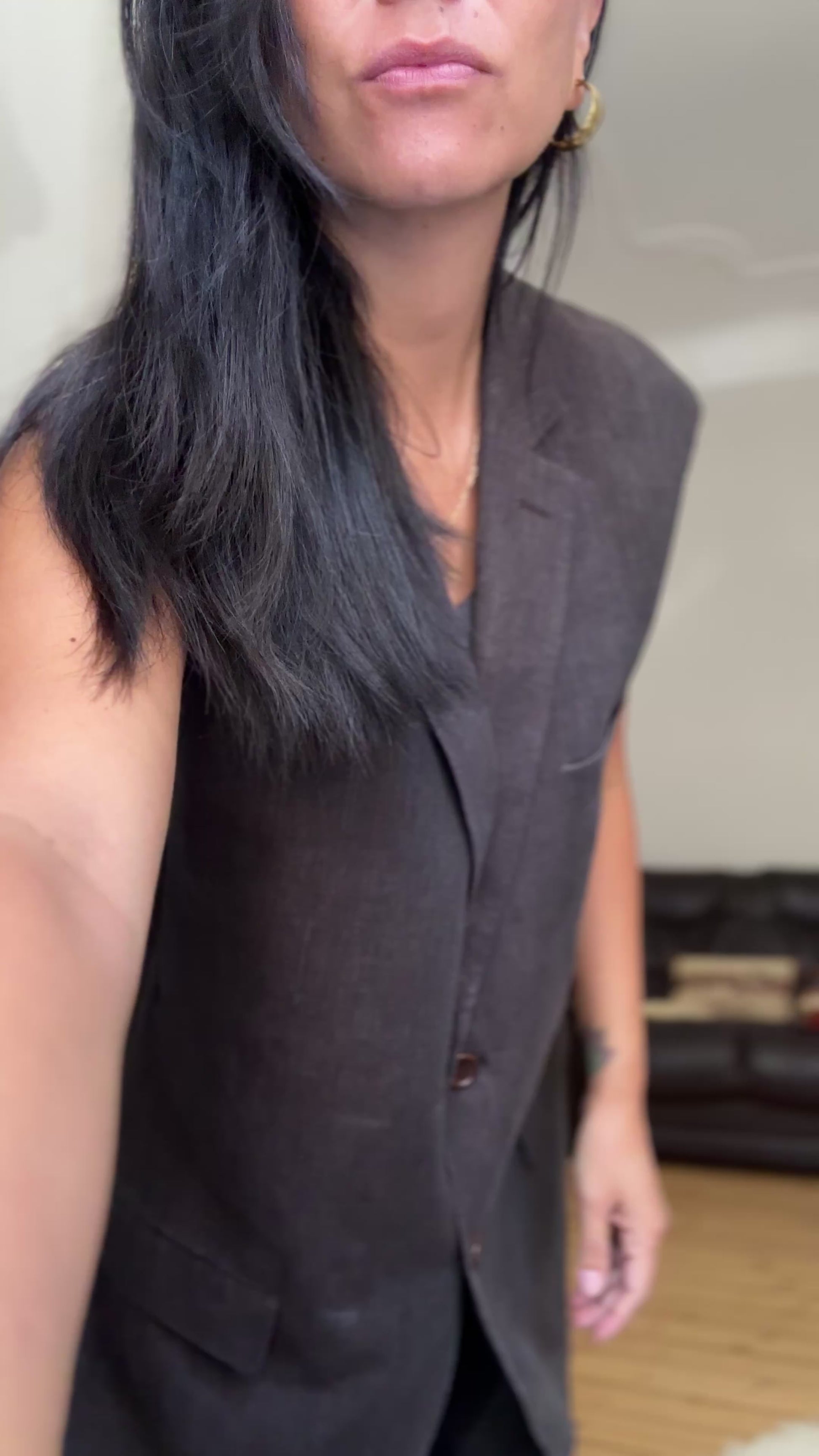 This gorgeous vest is crafted from a men's linen blazer. It's fully lined and has a button closure. On the back, it features a silk bow brooch that can be removed.
