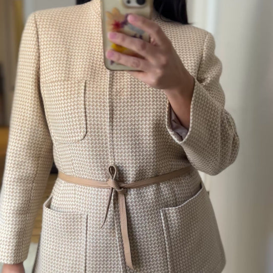 Fantastic vintage jacket, which is exceptionally well crafted and perfect for the fall. It has a thin leather belt, two hidden buttons and two front pockets.