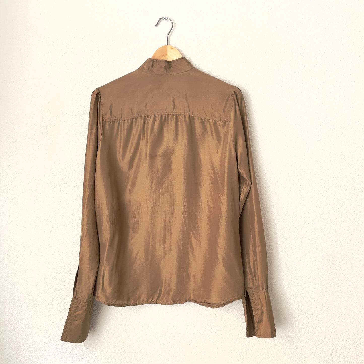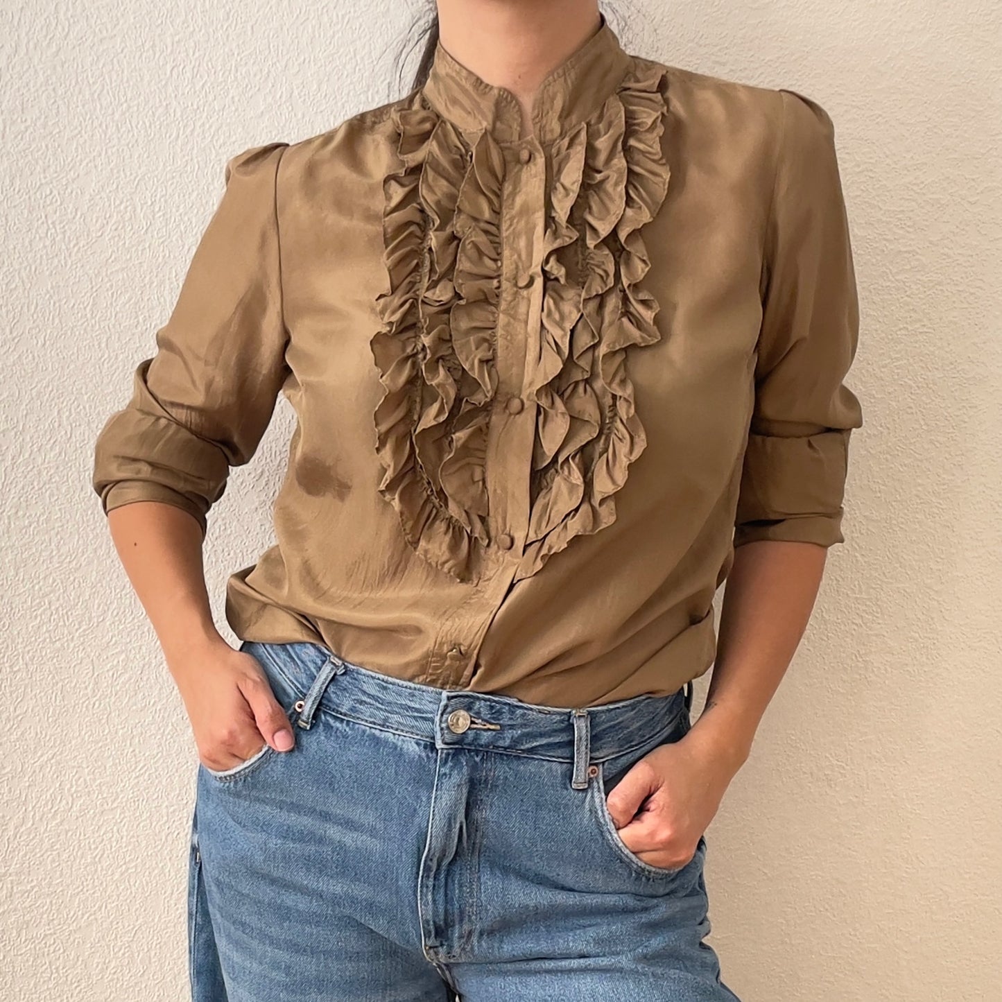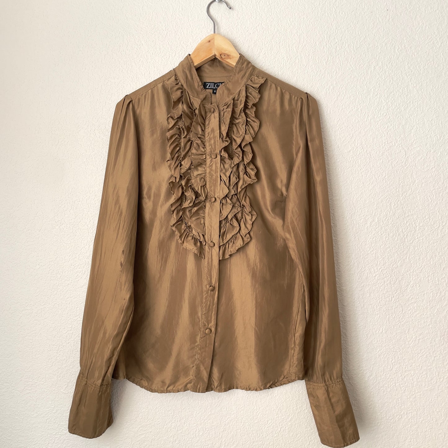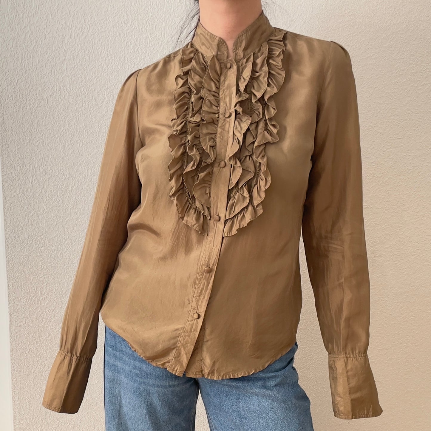 Gorgeous brown silk blouse with a ruffled front panel, lined buttons and French cuffs (no cufflinks included).