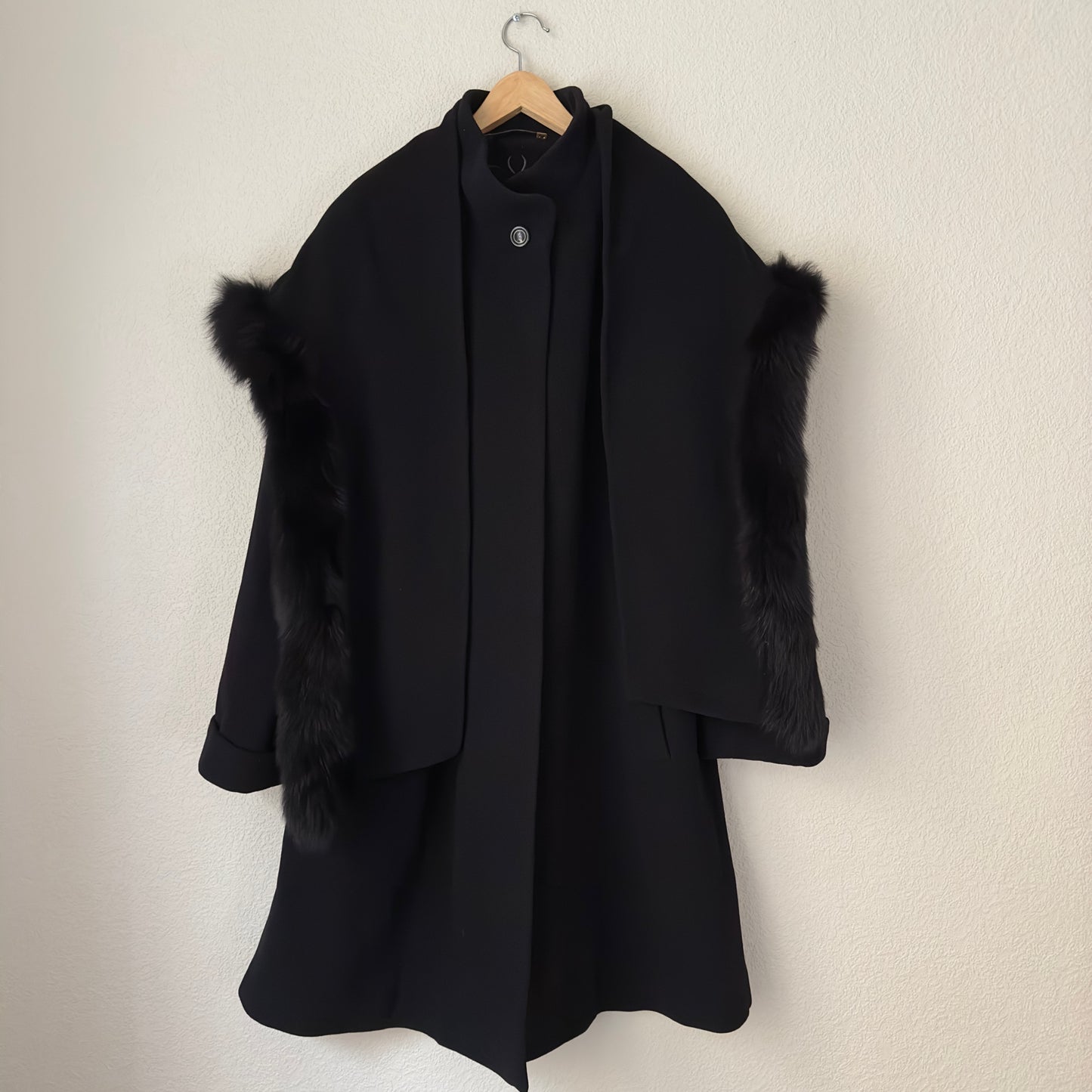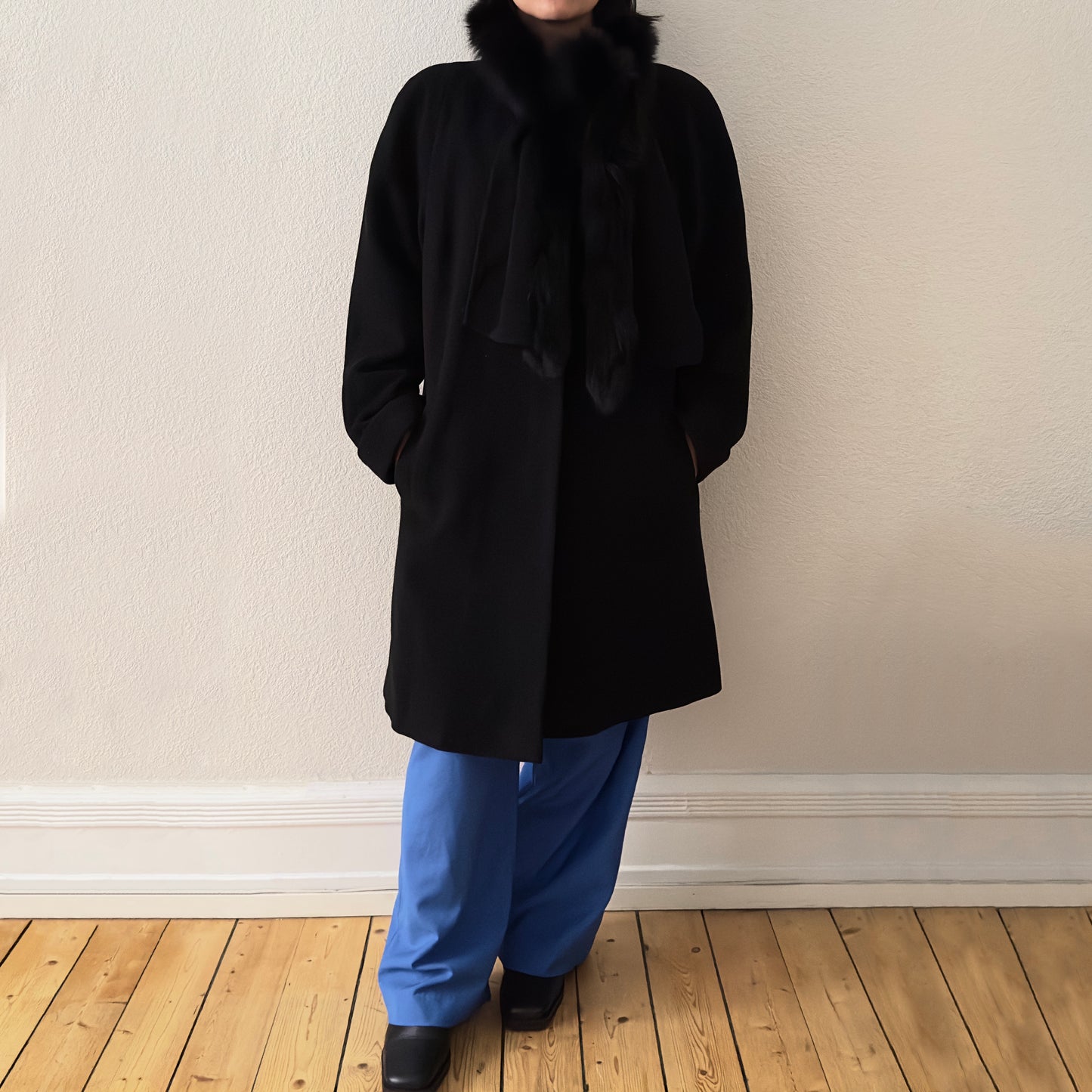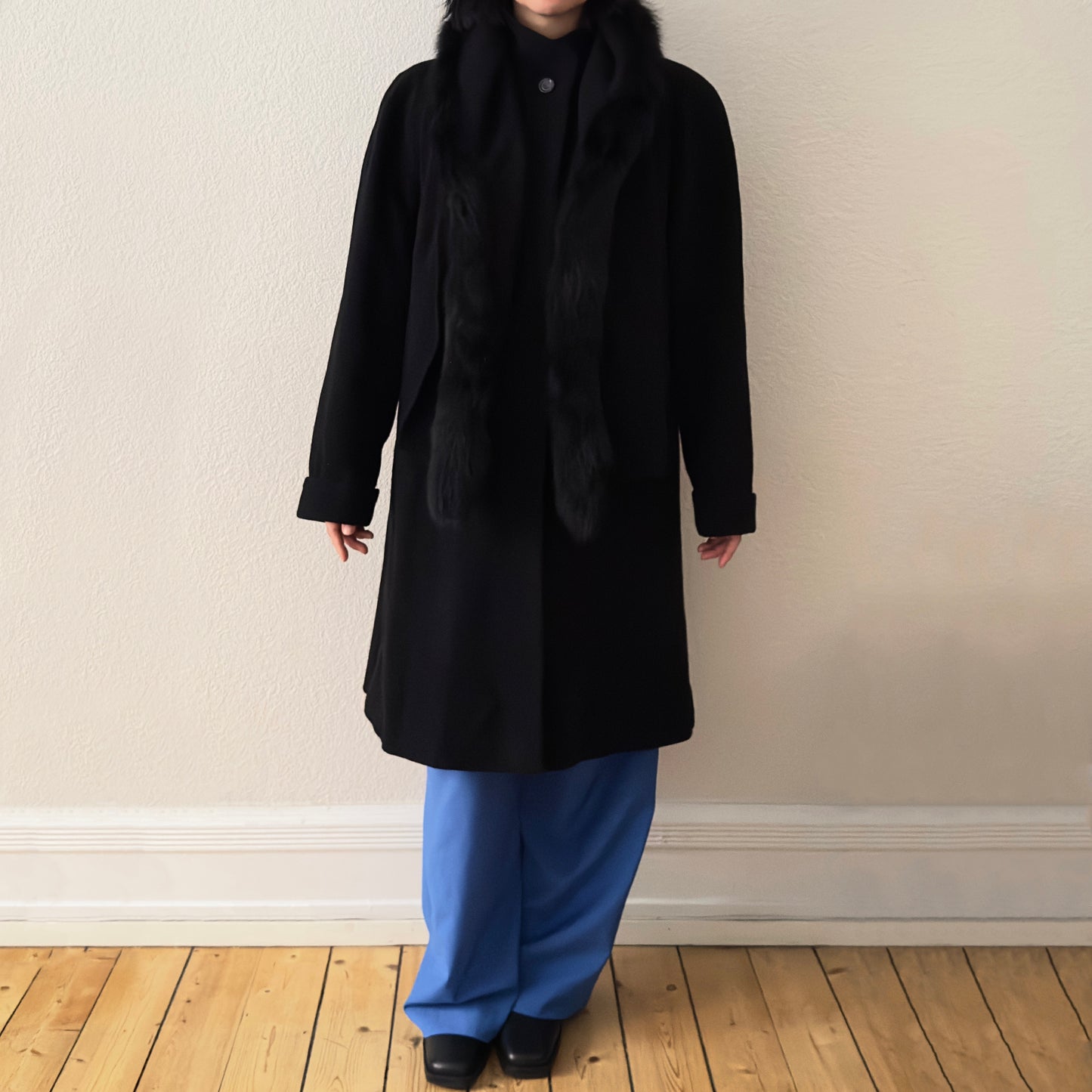 Vintage Black coat with an attached scarf that has real fur trim on one of the edges. It’s made from nice and soft wool-cashmere blend. Designed with a slight a-line silhouette with slits on the side, it has dropped shoulders and welt pockets. Oh! And has an inner secret pocket! 🖤