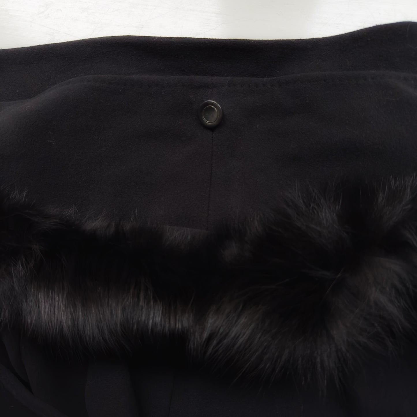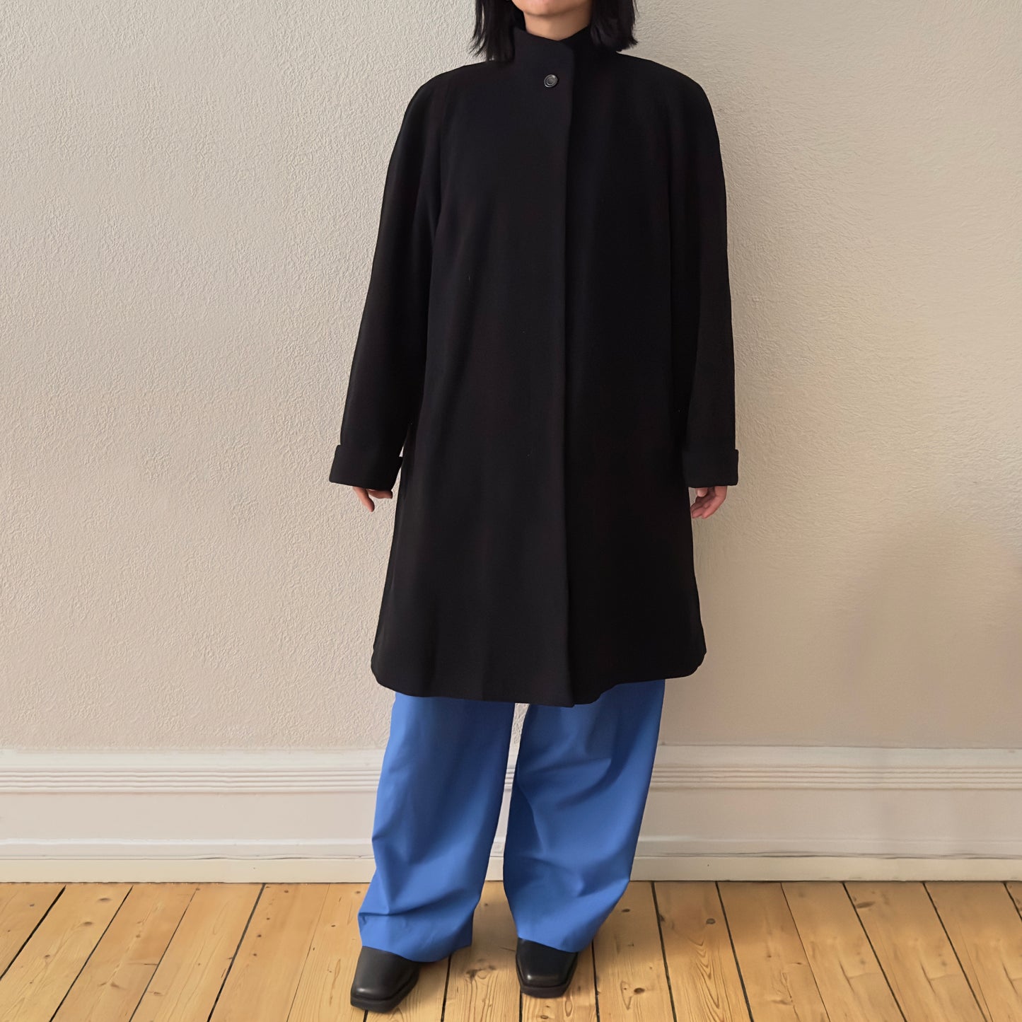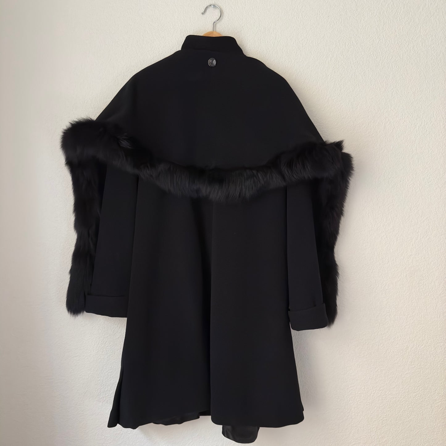 Vintage Black coat with an attached scarf that has real fur trim on one of the edges. It’s made from nice and soft wool-cashmere blend. Designed with a slight a-line silhouette with slits on the side, it has dropped shoulders and welt pockets. Oh! And has an inner secret pocket! 🖤